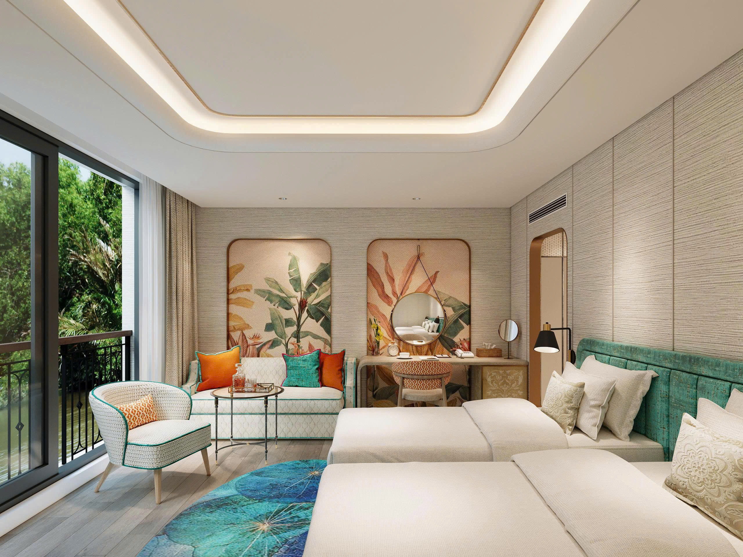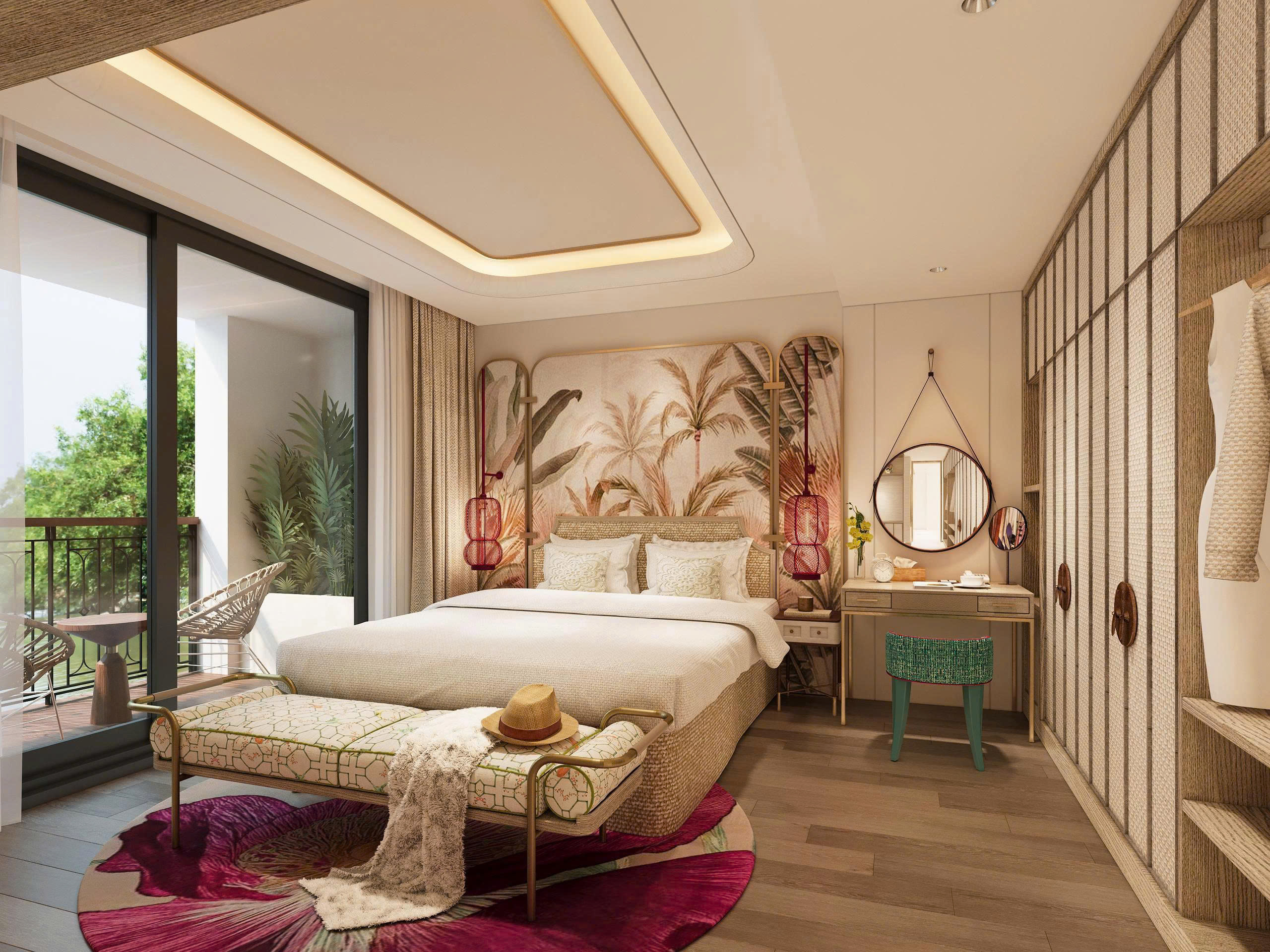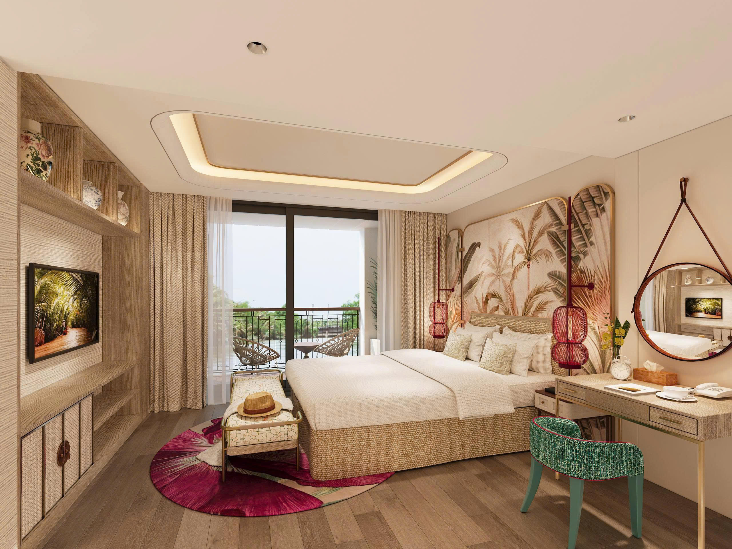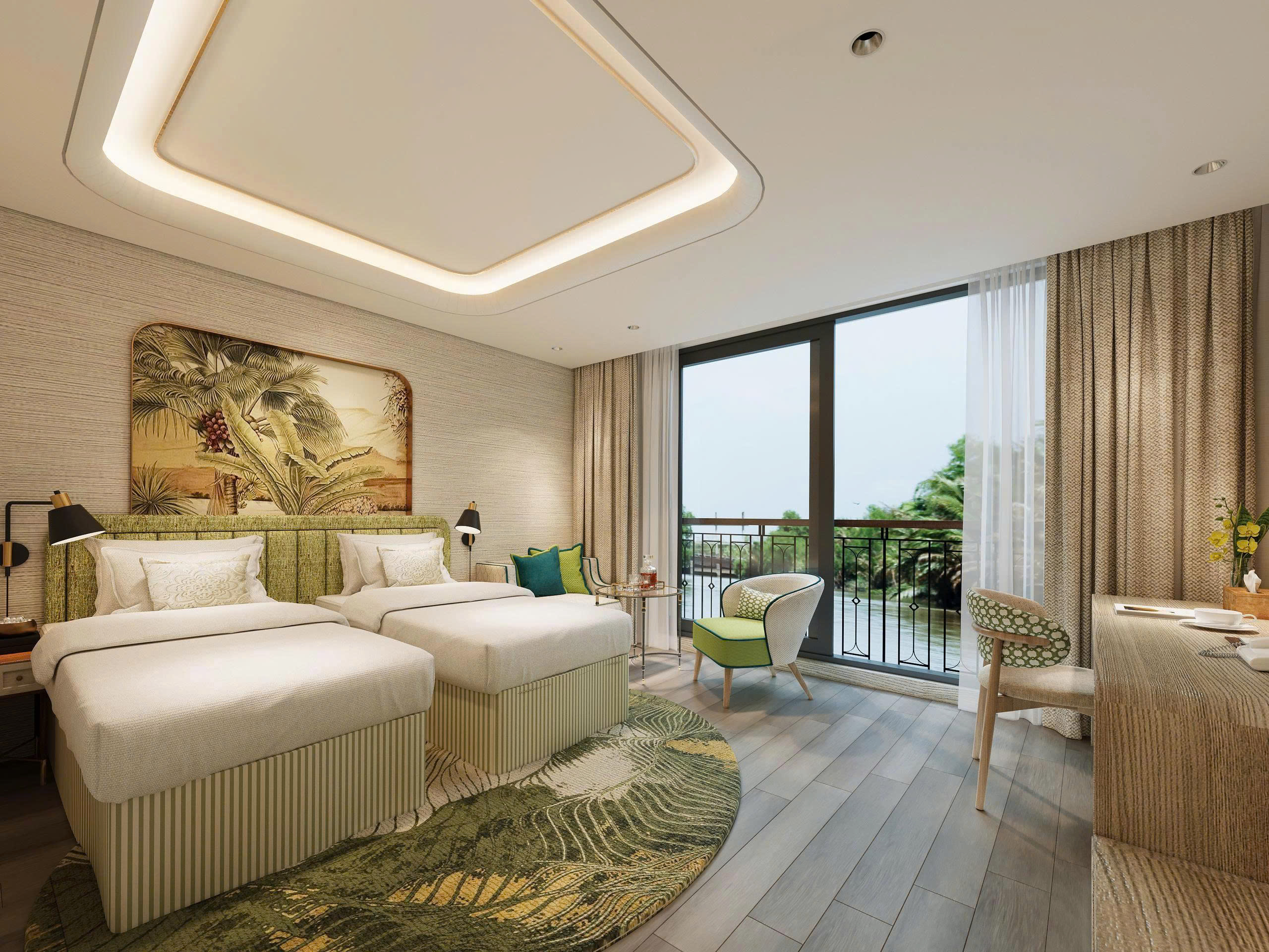 Das Herzstück der Signature Suite ist der französische Balkon, der es Ihnen ermöglicht, Ihr Zimmer für die sanfte Brise und die faszinierenden Klänge des Mekong zu öffnen. Es ist der ideale Aussichtspunkt, um das Leben am Ufer bequem von Ihrem privaten Refugium aus zu beobachten.
